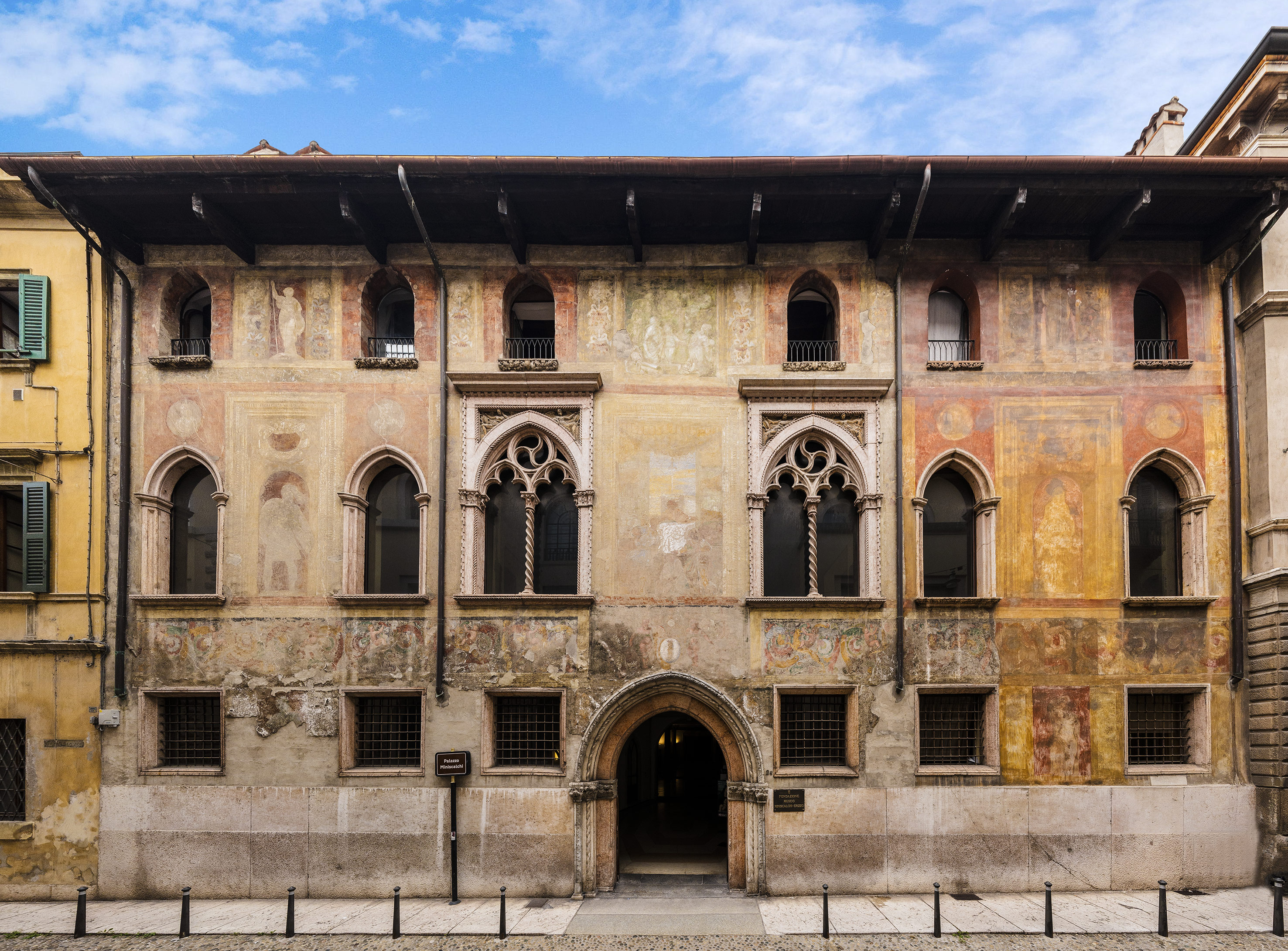Miniscalchi Palace is a fine example of the Gothic style of the 15th century. In the 16th century, while retaining its façade, it was enlarged and adorned with frescoes by Michelangelo Aliprandi and Tullio India. The frescoes, however, were damaged by wartime bombing: an initial restoration, commissioned by Count Marcantonio Miniscalchi in the early 19th century, was followed by a second restoration between 1951-1953 to repair the severe damage caused by the war.